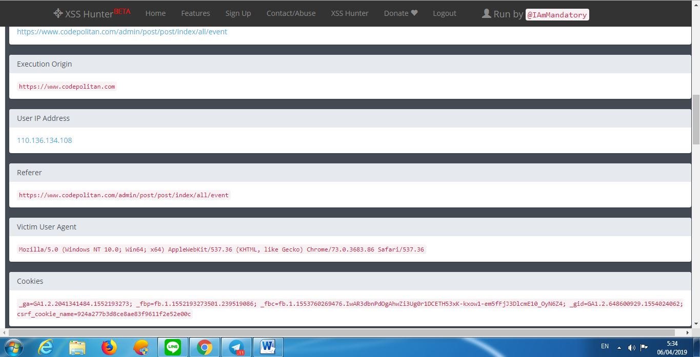 Kurang lebih saya menunggu hampir 1 sampai 2 minggu tidak ada notifikasi trigger yang masuk ke xss hunter saya , disana saya mulai pupus harapan hehe. Pada tanggal 5 april saya mendapat sebuah notifkasi melalui email , dan ternyata umpan saya berhasil di makan oleh admin codepolitan .